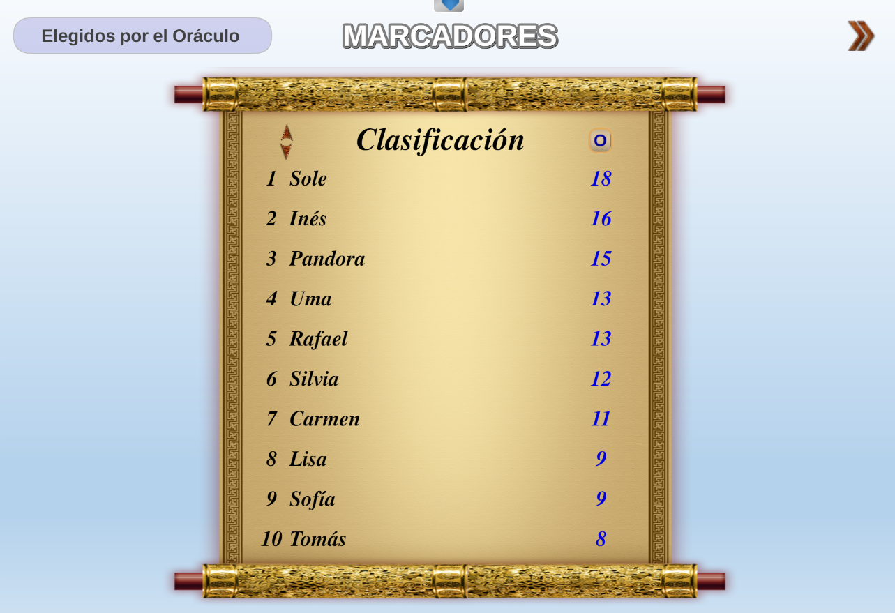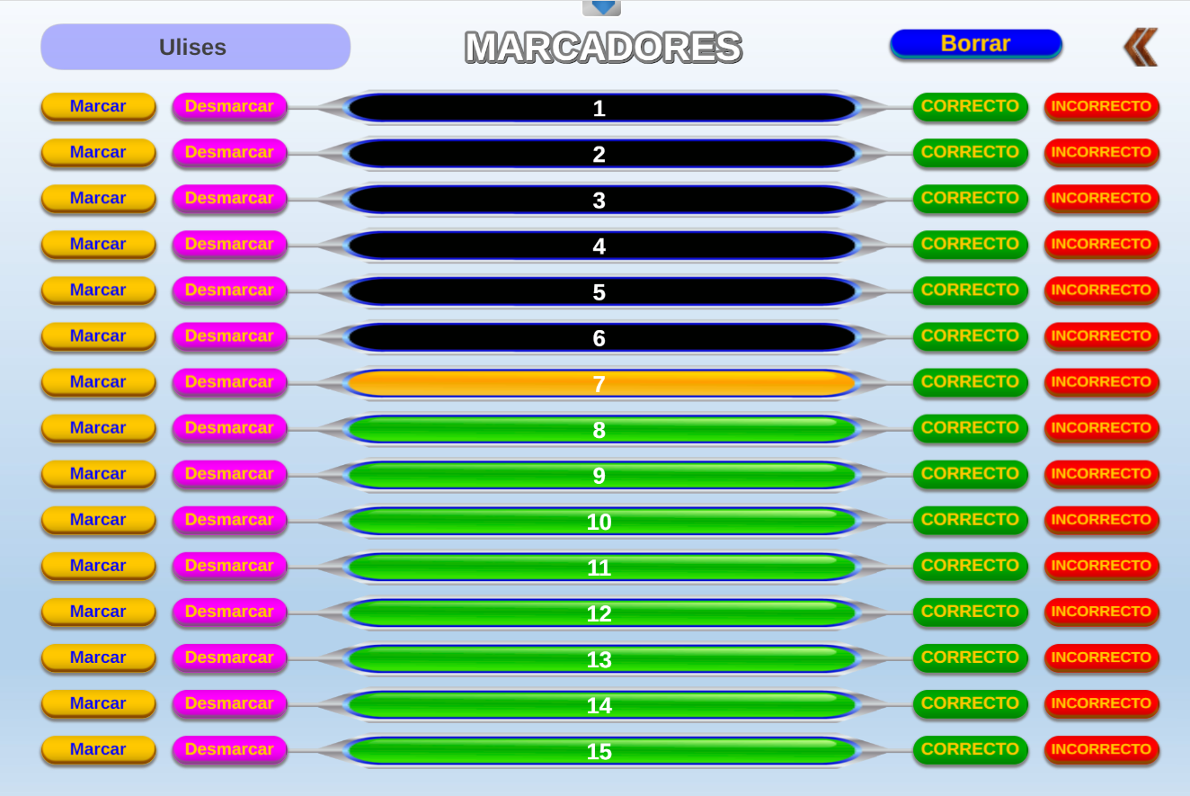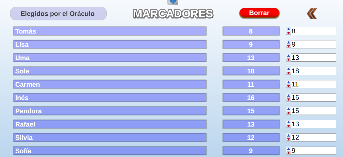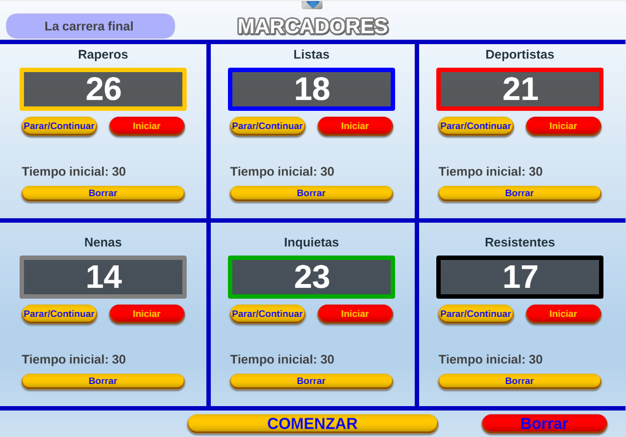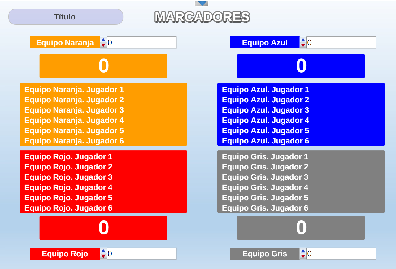 - Juego "Marcadores". Dispone de los siguientes elementos de interés: marcadores individuales y por equipos, clasificaciones y escaletas. Todos ellos son personalizables. Se pueden guardar y extraer los resultados en archivos de texto.