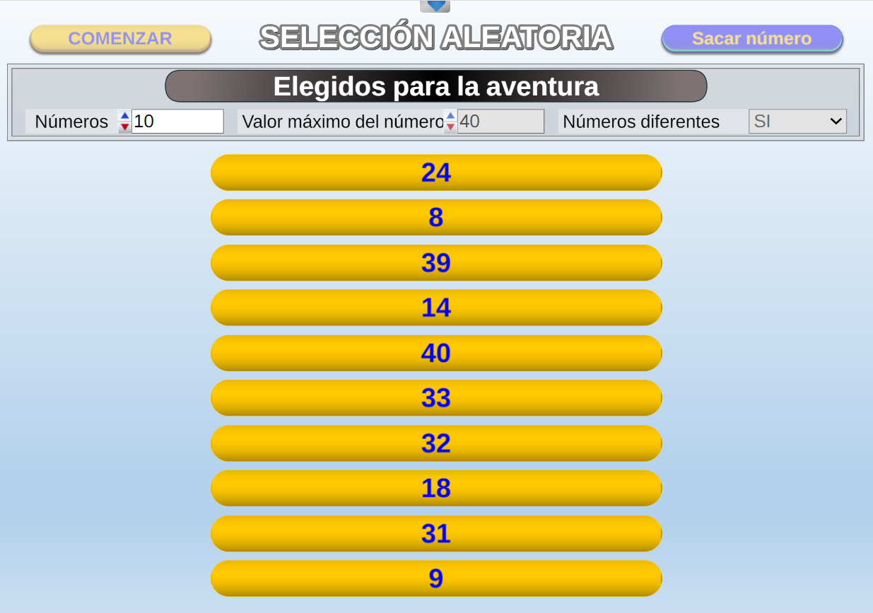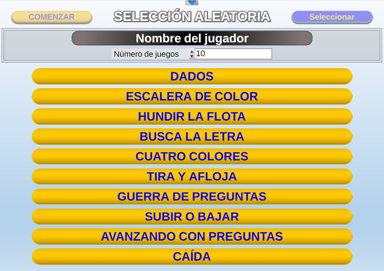 Juego "Selección aleatoria". Permite seleccionar a los participantes por sorteo y agruparlos por equipos. También posibilita realizar selecciones aleatorias de números, pudiendo personalizarse los criterios de selección y también ofrece la posibilidad de realizar selecciones de juegos del Proyecto AJDA de forma aleatoria. Introducir este factor de aleatoriedad y selección en la dinámica "da mucho juego".