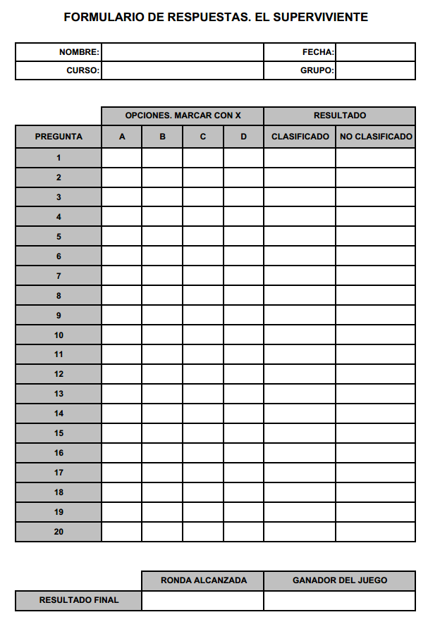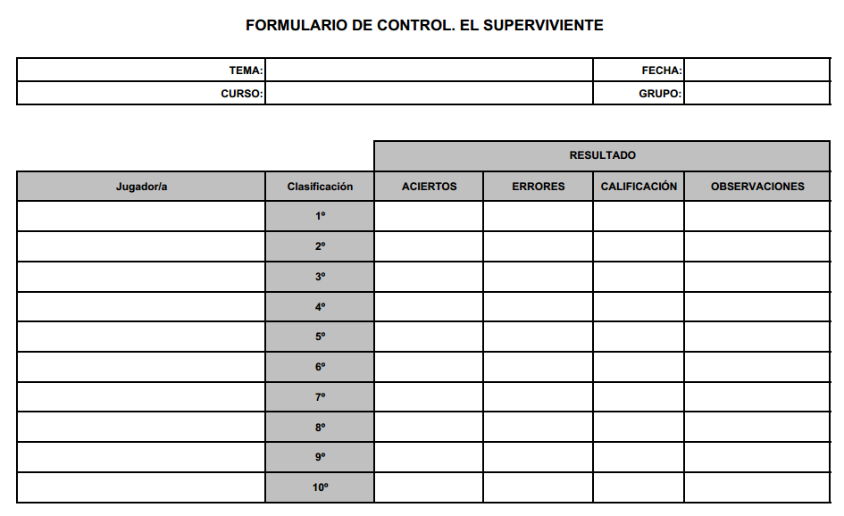 - Documento de registro y evaluación del profesorado. Todos los juegos contienen este documento, en el que el docente podrá anotar o recoger en él los resultados obtenidos en la actividad. Como ejemplo, se presenta el elaborado para el juego "El superviviente".